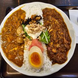 まずは左のヨーグルトチキンから。ヨーグルトを使っているからか円やかな味わいながらしっかりとスパイスが効いており、辛さ自体はポークより強め。鶏肉がたっぷりと入り、パラパラのインディカ米... 続きを見る